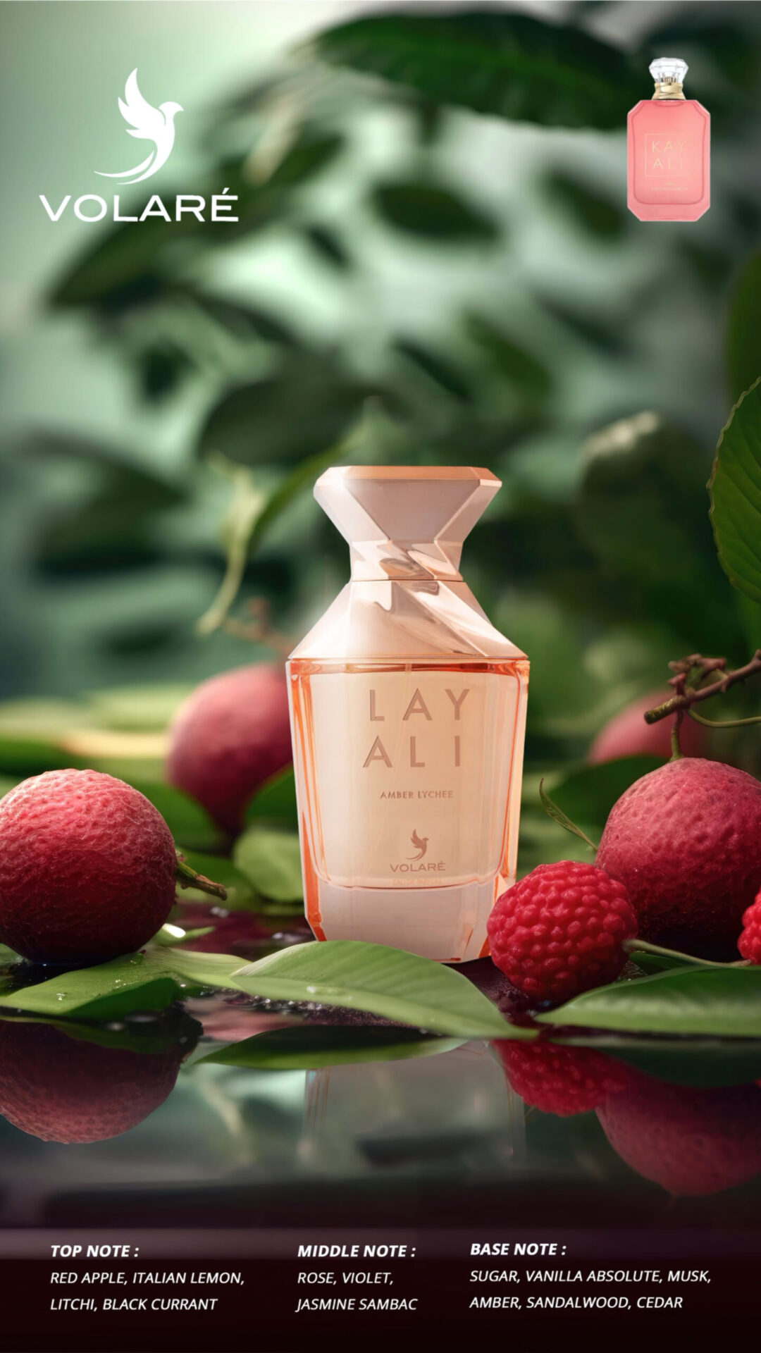 From the first spray, Layali Amber Lychee Eau de Parfum delights your senses with a vibrant blend of: