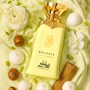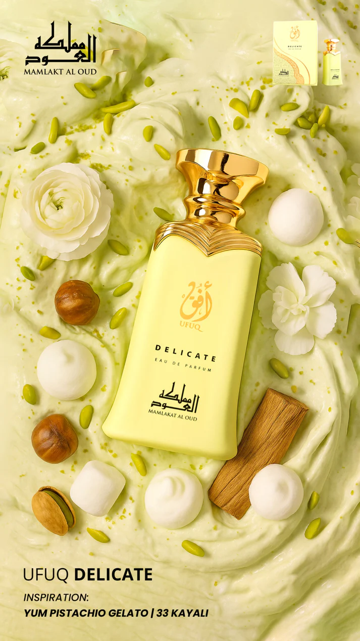 Discover Ufuq Delicate, a unisex fragrance that brings the flavour of pure happiness to your skin. Inspired by Yum Pistachio Gelato | 33 by Kayali Fragrances, this creation takes you on a delicious olfactory journey – from the refreshing freshness of an Italian dessert to the velvety softness of a gourmand veil that lingers for hours.