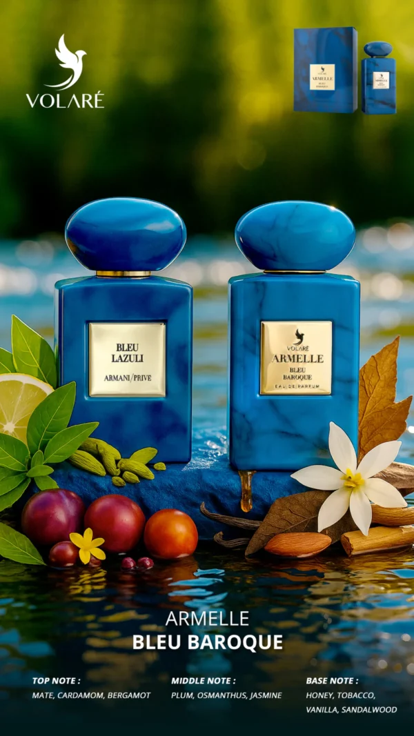 Volare Armelle Bleu Baroque Eau de Parfum Volare Armelle Bleu Baroque is inspired by the niche creation Bleu Lazuli by Armani Privé, reinterpreted in a warm, sophisticated and full of character.