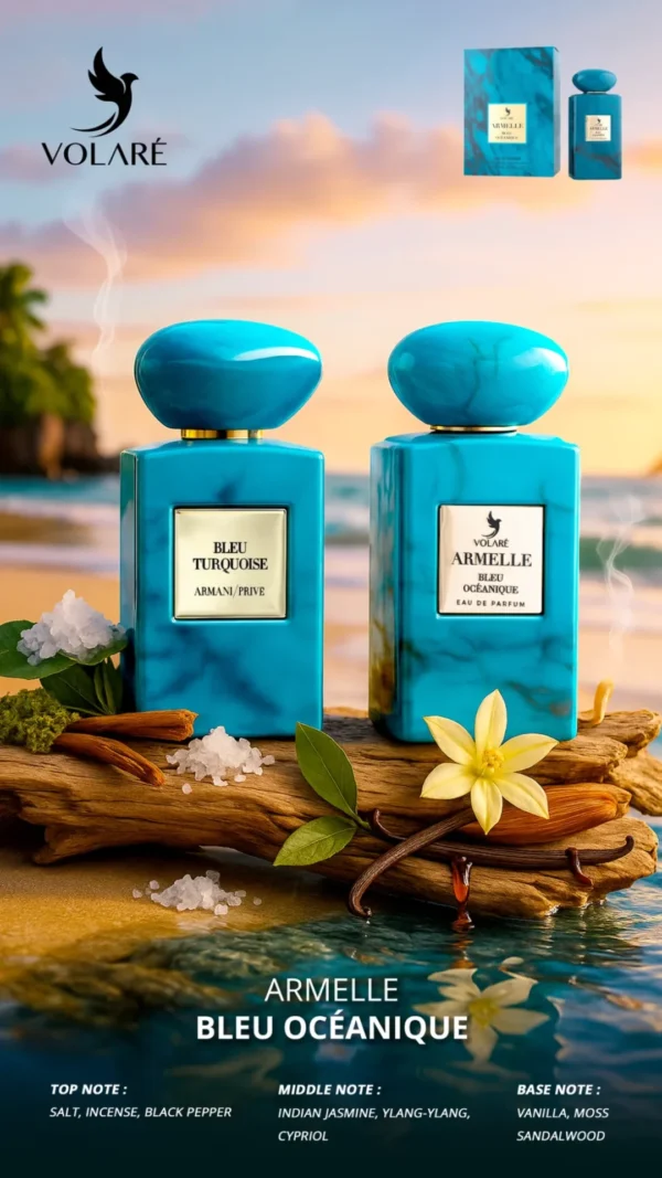 A unisex fragrance inspired by the olfactory masterpiece Bleu Turquoise by Armani Privé, where the ocean breeze meets the velvety warmth of vanilla.