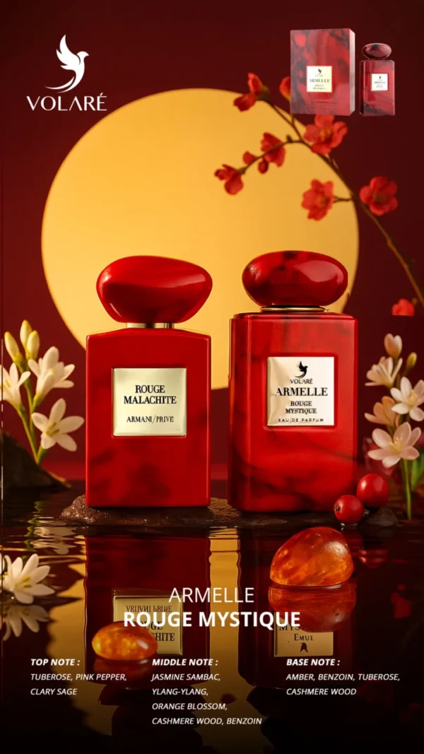 Volare Armelle Rouge Mystique Eau de Parfum is inspired by the exquisite Rouge Malachite by Armani Privé, an olfactory masterpiece that celebrates the mystery and passion of white flowers.