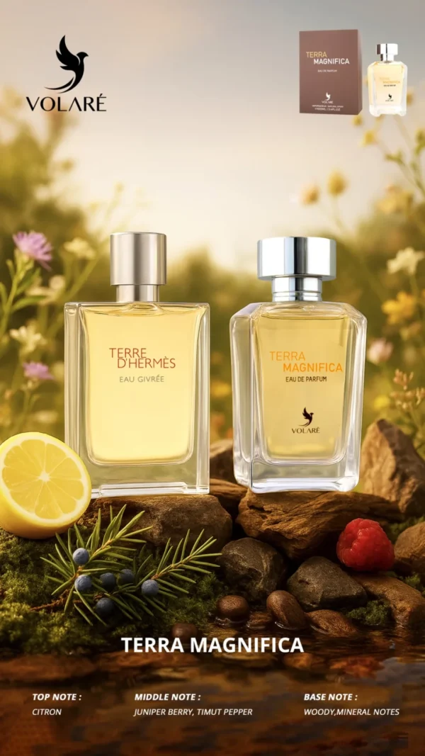 Discover Volare Terra Magnifica, a masculine fragrance that unites the natural strength of the earth with the freshness of the clear air. Inspired by Terre d’Hermès Eau Givrée by Hermès, this fragrance expresses the perfect balance between energy, elegance and sophisticated simplicity.