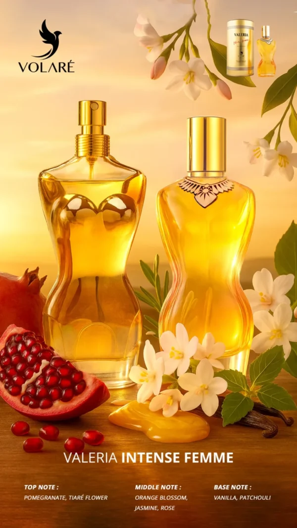Volare Valeria Intense Femme evokes the energy and elegance of a confident woman. Fresh pomegranate notes melt into a radiant floral bouquet, complemented by warm vanilla and patchouli, creating a modern, sophisticated and memorable fragrance.