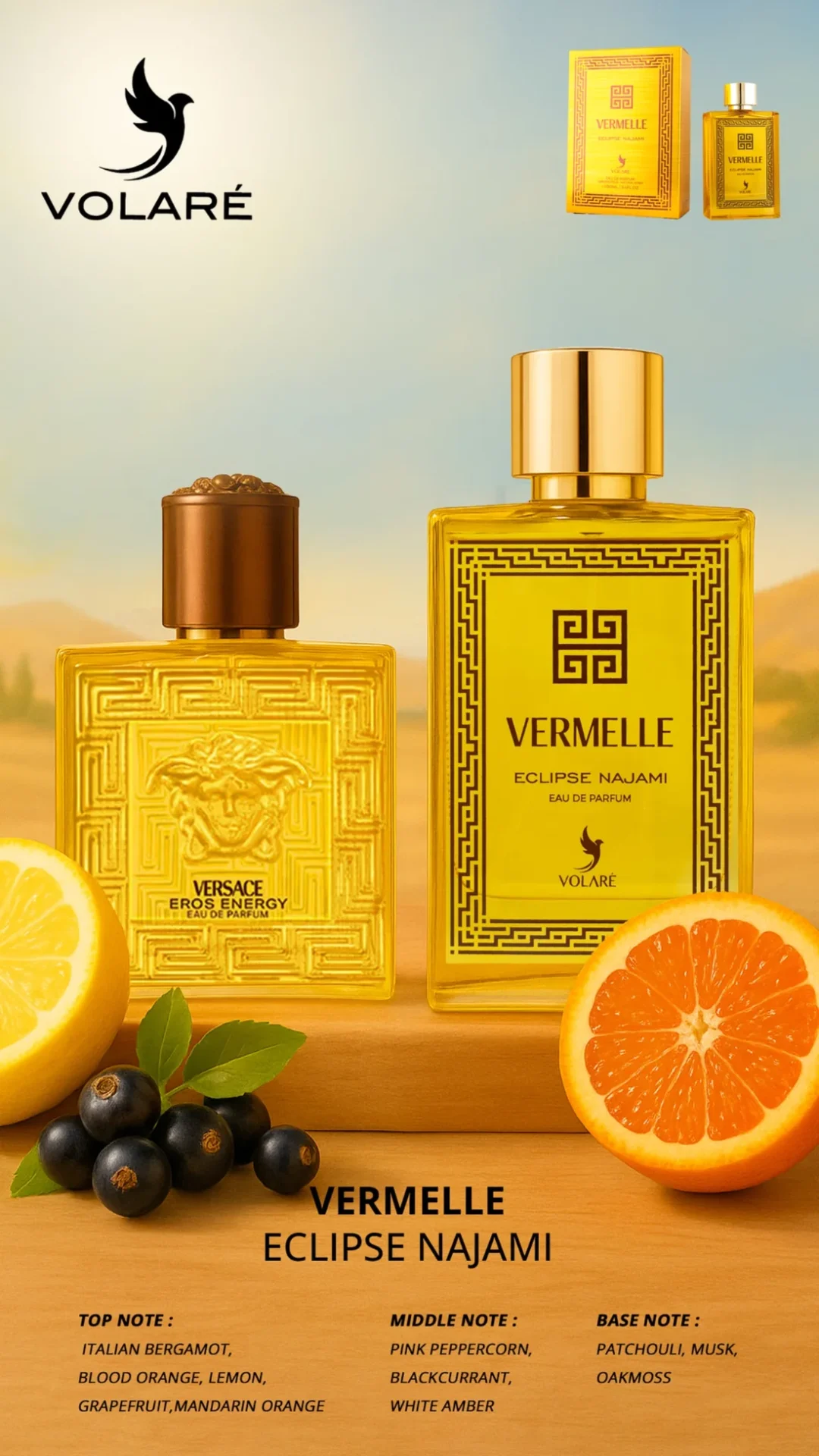 From the freshness of Italian citrus to the refinement of white amber and the depth of patchouli, Volare Vermelle Eclipse Najami takes you on an olfactory journey of energy and elegance. It is the fragrance that inspires strength, freedom and charisma – the perfect signature of a man who knows who he is.